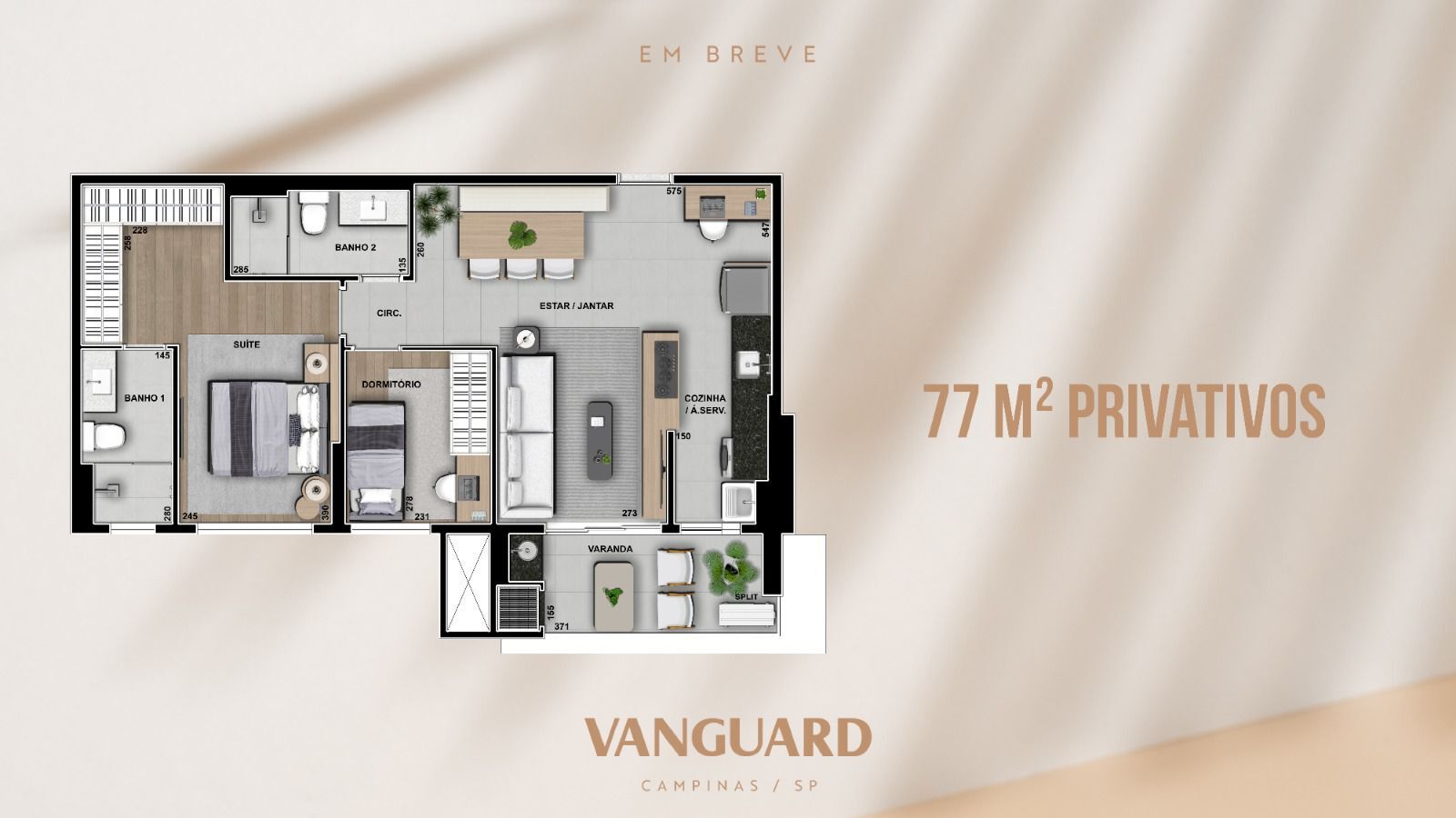 Unidades tipo com metragens, de 68, 77, 96 e 105 m² e Penthouses de 144 e 198 m²