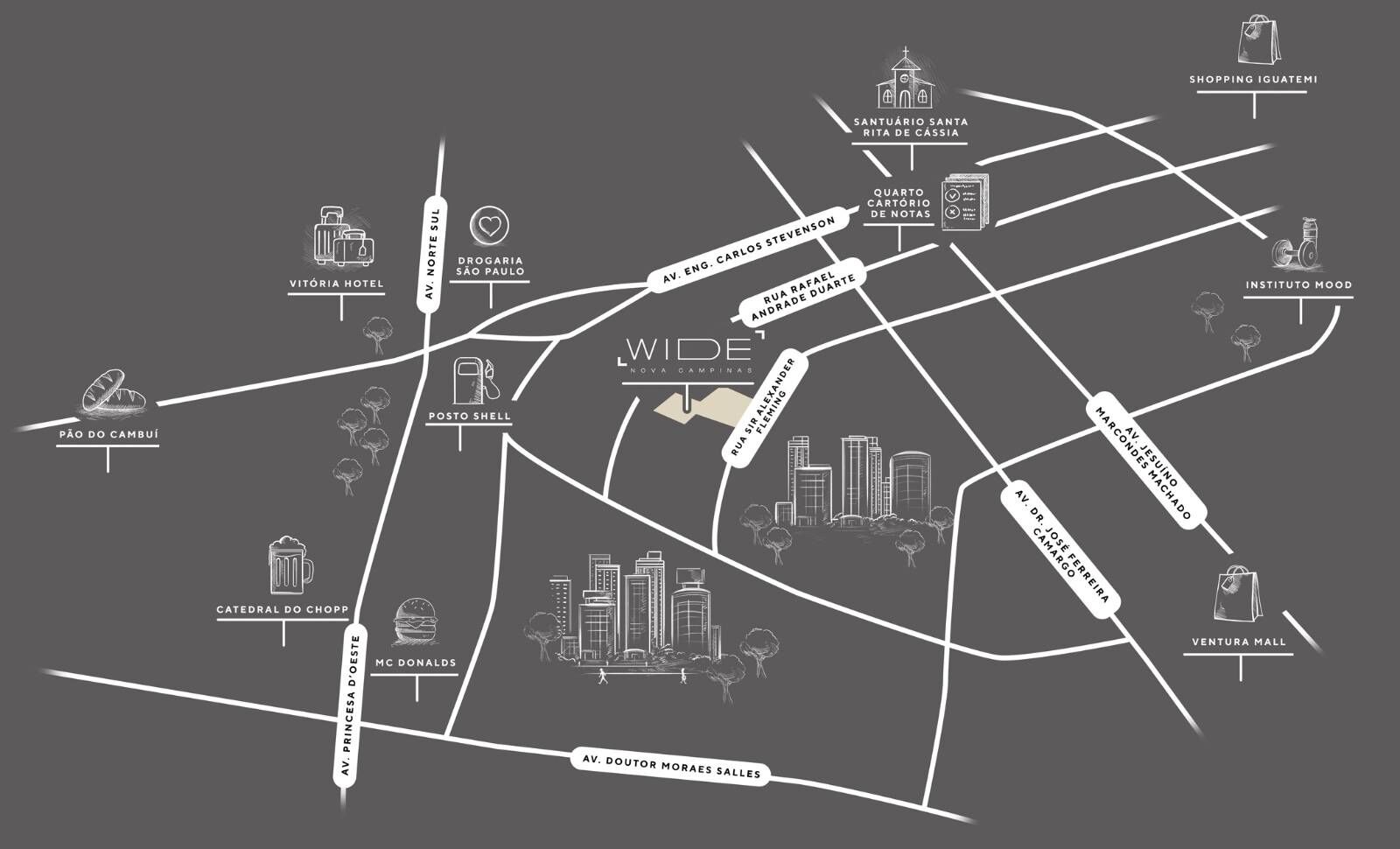 Além disso, a localização privilegiada proporciona fácil acesso a escolas, faculdades, hospitais, supermercados, shoppings e muito mais. O Wide Nova Campinas está localizado no Bairro Nova Campinas, entre a Av. José de Souza Campos (Norte Sul) e Av. Dr. Jesuíno Marcondes Machado, em uma região de alta renda per capita e metro quadrado extremamente valorizado.
