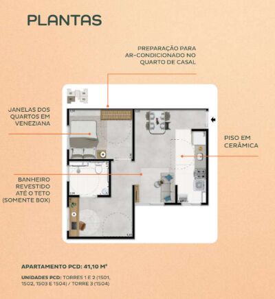 Com 2 dormitórios, 1 vaga de garagem, com 41 m² para unidade tipo com sacada e 46 m² para unidades gardens , apartamento perfeito pra quem tá quer sair do aluguel.